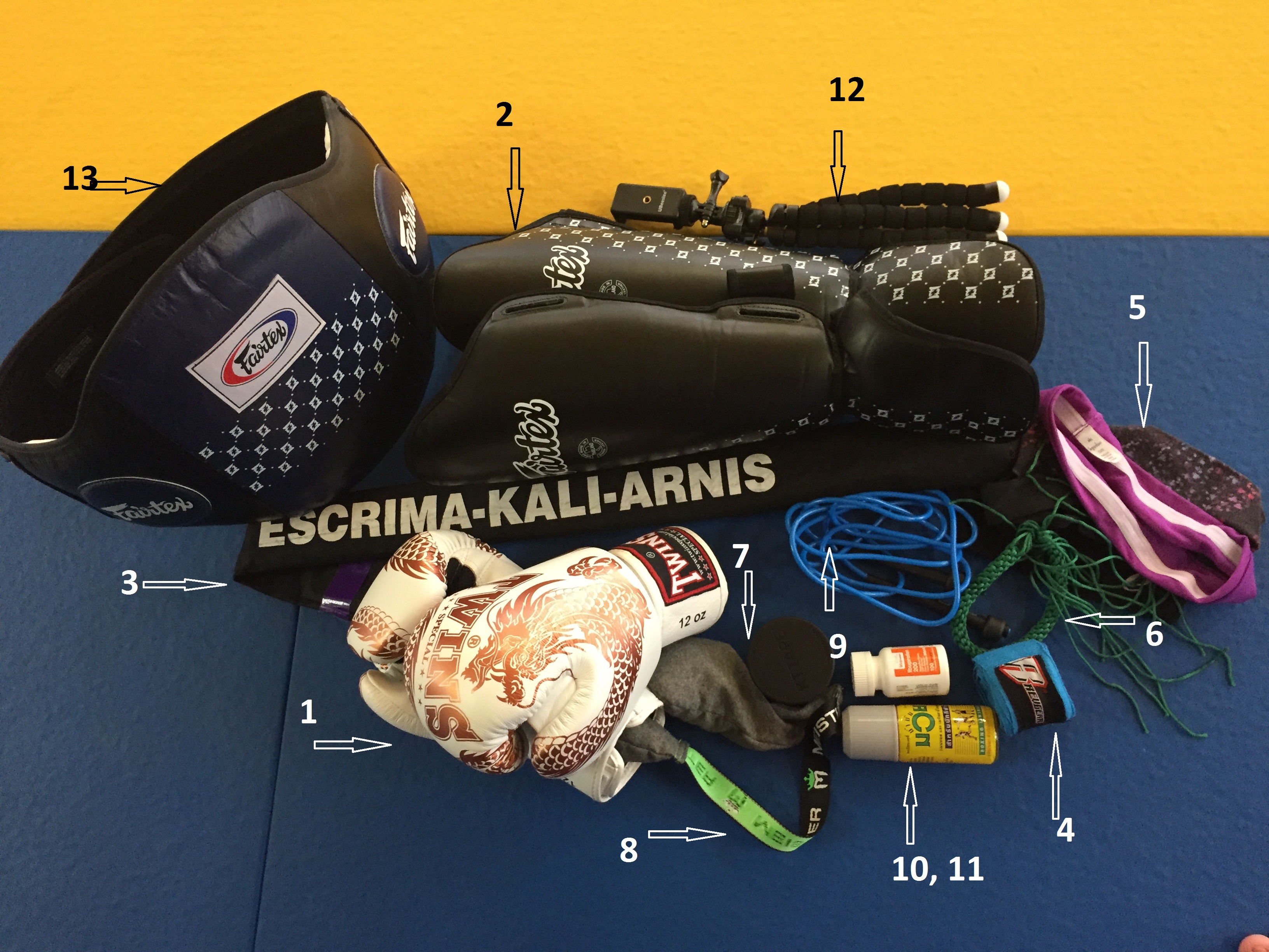 Thai shorts, water bottle, ankle brace, and mouth guard are not pictured here.