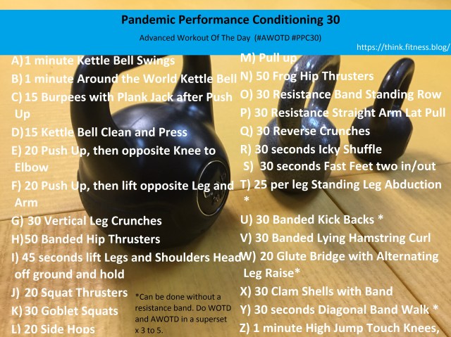 The first slip of paper will be the regular Workout Of The Day, and the second one will be from the Advanced Workout Of The Day. The regular workout of the day requires no equipment. The advanced requires some equipment (kb or dumbell, and resistance bands).
