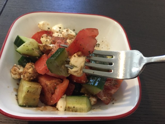 - Slice up any vegetable you like, I used, cucumber, bell peppers, spinach, red onion, tomato