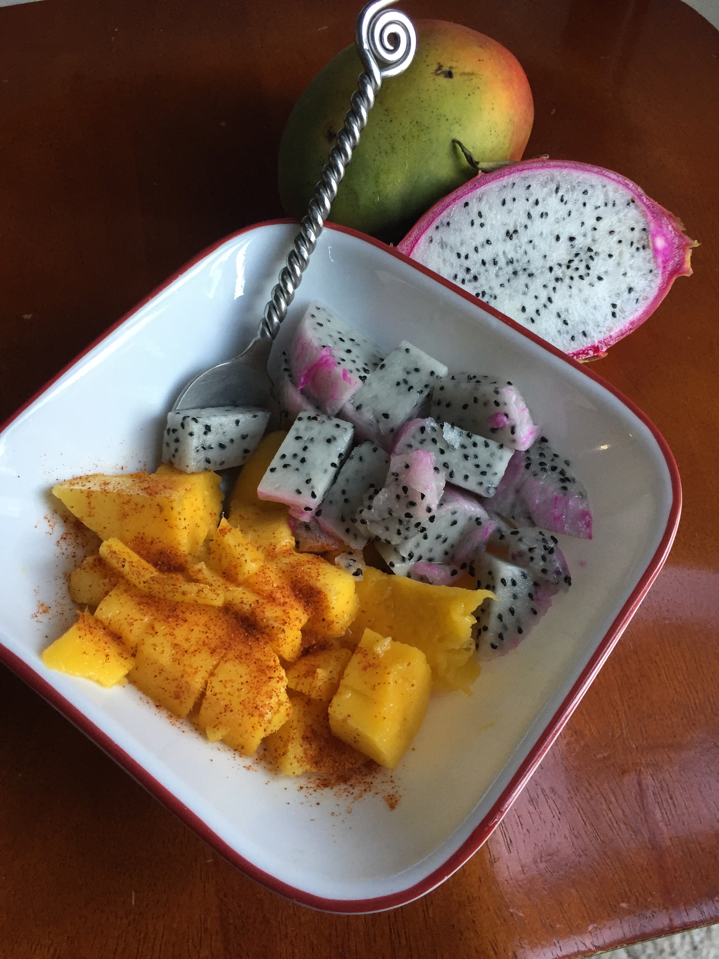 I wanted a sweet and spicy snack so I “made” this. Made is such a grand word for what I did. I cut up some fruit and put it together added spice, and coconut and ate it. But made it I did. It is beautiful and so very tasty as well. You eat with your eyes first so it if is beautiful, it is more appetizing.