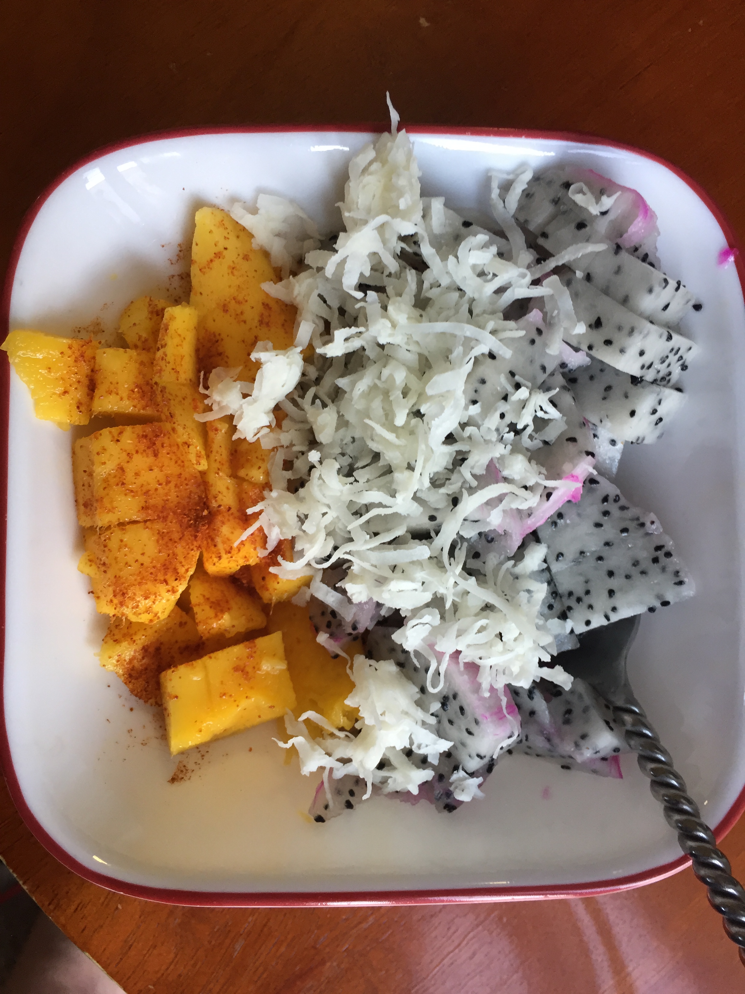 Cut fruit, add to bowl, add cayenne to mango, add unsweetened coconut. Mix and serve.