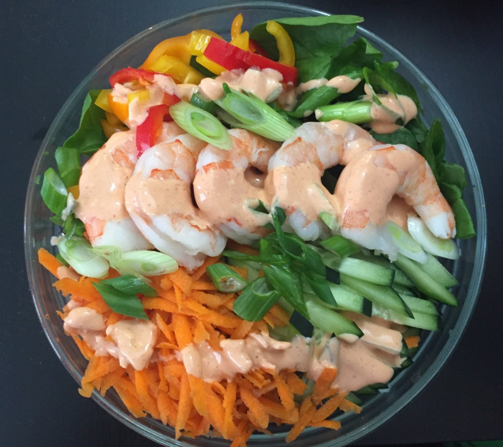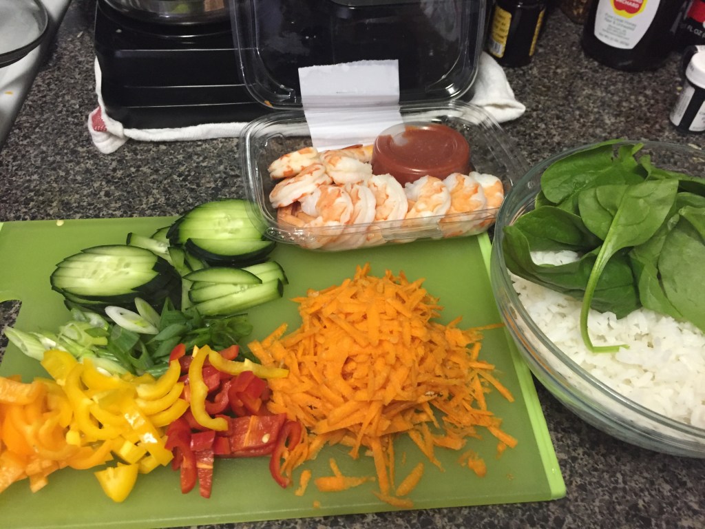 - Slice up any vegetable you like, I used, cucumber, bell peppers, spinach, red onion, tomato