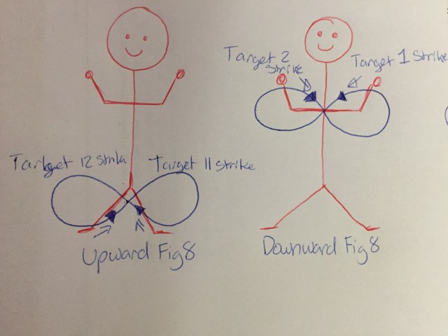 Upward figure 8, with low back hand strike and high back hand strike.
