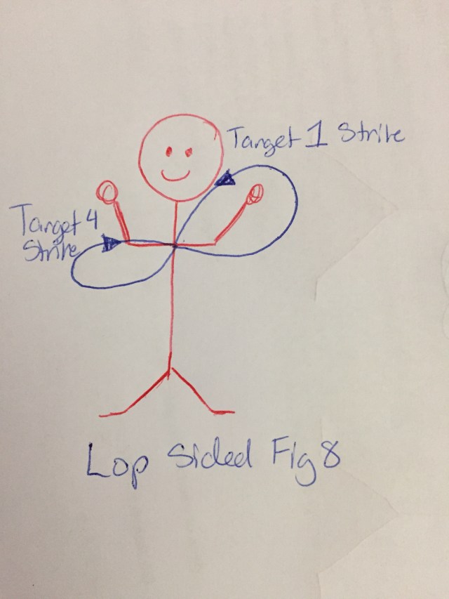 In this last figure you see the lop sided figure 8. You are targeting the 1 strike point, and the 4 strike point. These figure 8 were fun, and hard at the same time. Hefting the staff and trying to follow through in the strike is hard, when it meets a resistance and wants to just bounce back.