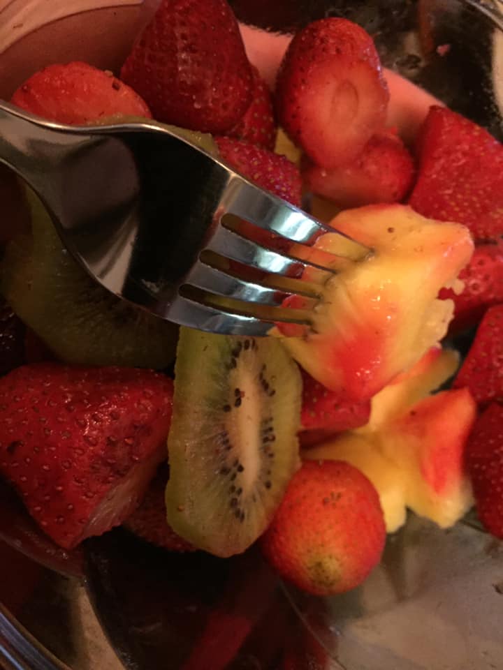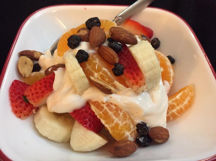 So I had my last meal after my workout because I was ravenous and I was super thirsty. Yogurt with strawberries and apples, unsweetened coconut and some walnuts.