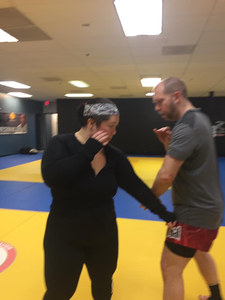 So today we worked on how to defend and react to a Jab, Cross combination. We worked on JKD or Jeet Kun Do, the martial arts created by Bruce Lee. Kru Krysta said if you get into a fight or fight in the ring, that Jab, Cross combo is going to come up, so knowing how address it, parry, block, catch and return an attack is very important. She told us her instructor called it ABD – or Attacking By Defense.