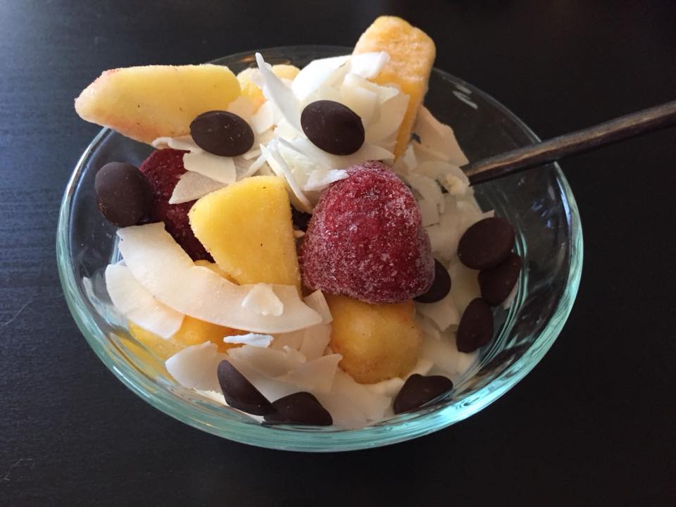 Blend together a banana, and a cup of frozen berries. If you need to splash a little coconut milk in it to allow for better pureeing.