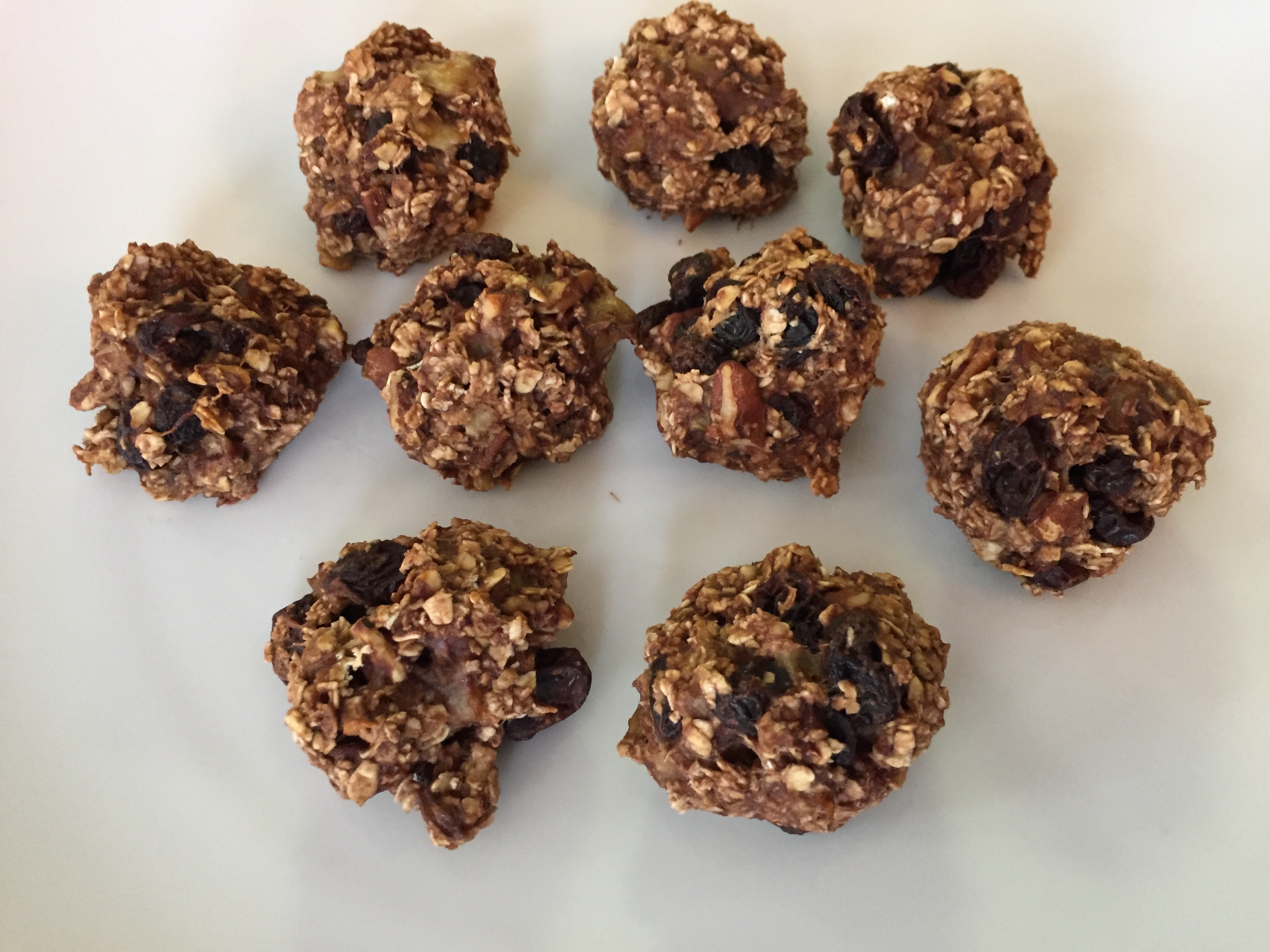Smash the bananas, mix in the oats, and then rest of the ingredients. Roll the mixture into a ball and then place on a greased parchment paper lined pan. Bake for 15 minutes.