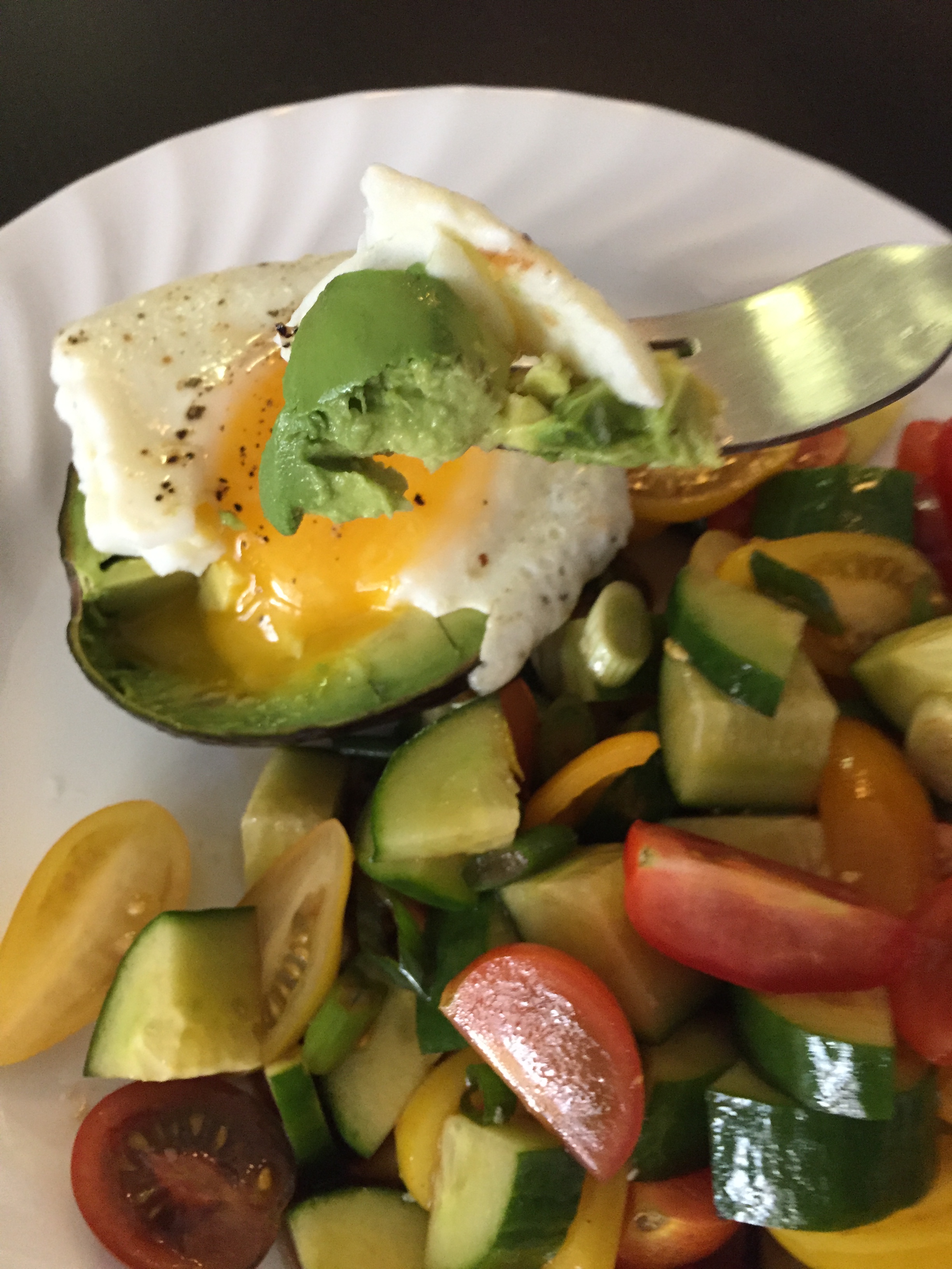 Fried Egg on an Avocado half, and tomato cucumber salad