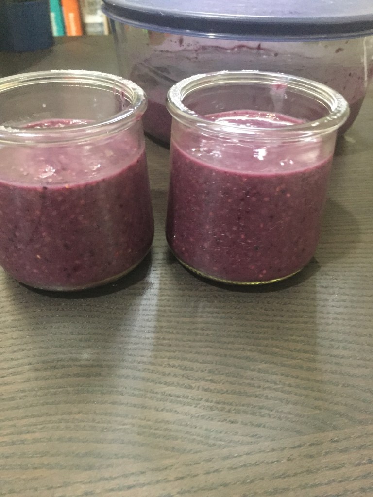Pour in fruit blend. Taste… it is plenty sweet with the fruit, but I wanted a more dessert like taste for this so I added the 1 tbs of honey to the mixture.
