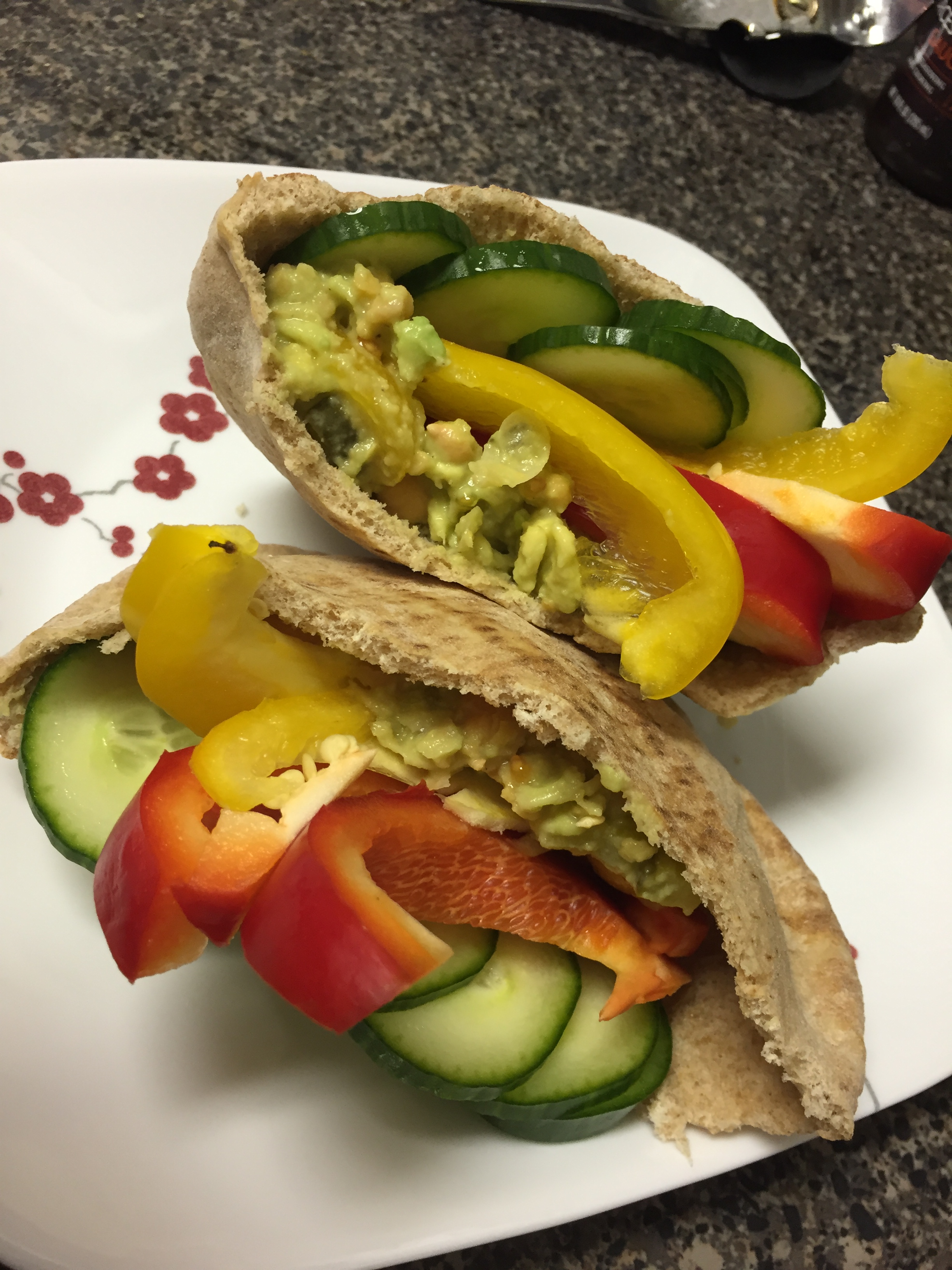 Today what I made was canned garbanzo beans, avocado, tomato, pickle juice in absence of lemon, and chopped dill pickles. I stuffed that into a pita and added fresh veggies, and it was oh so good.