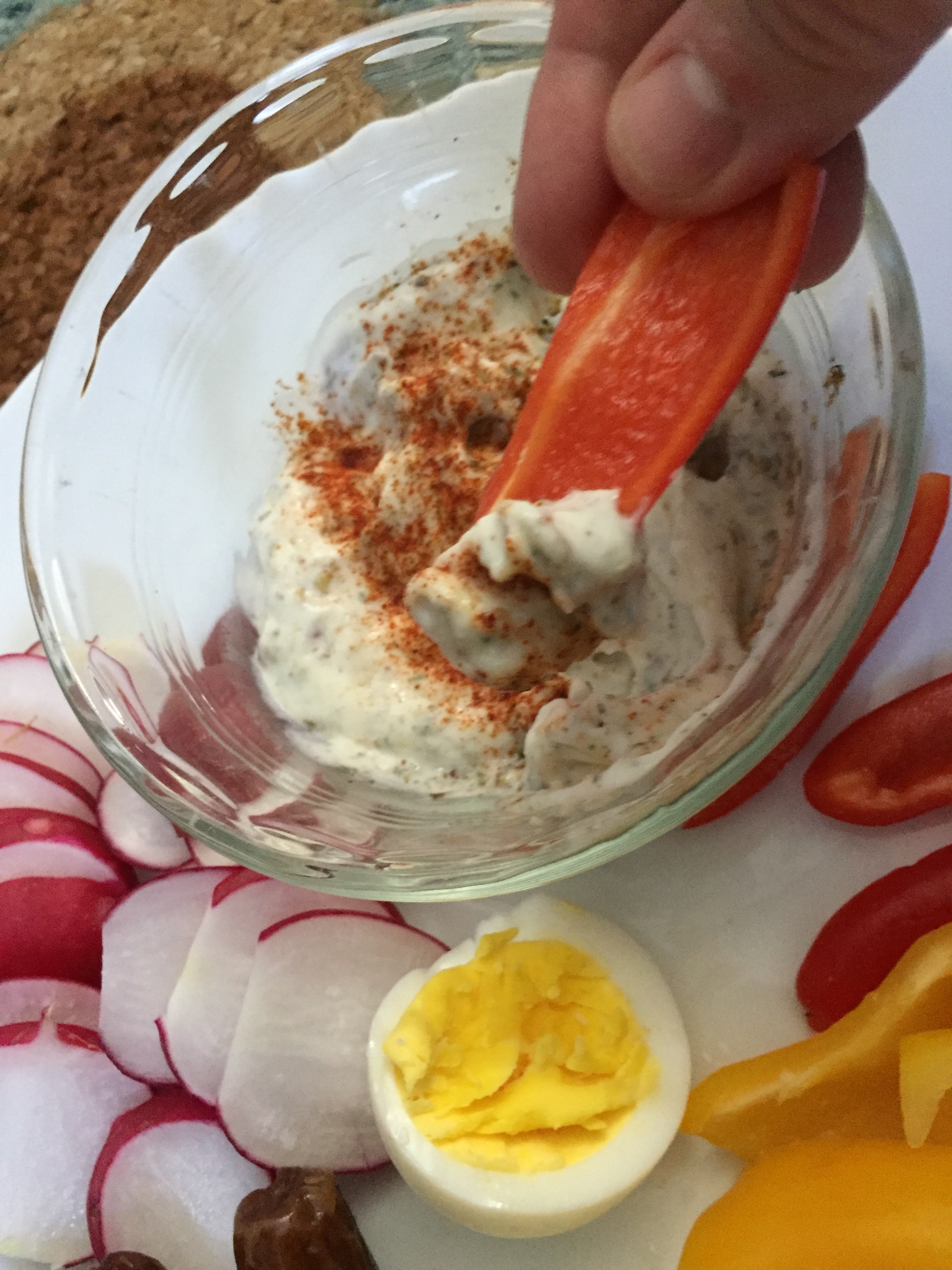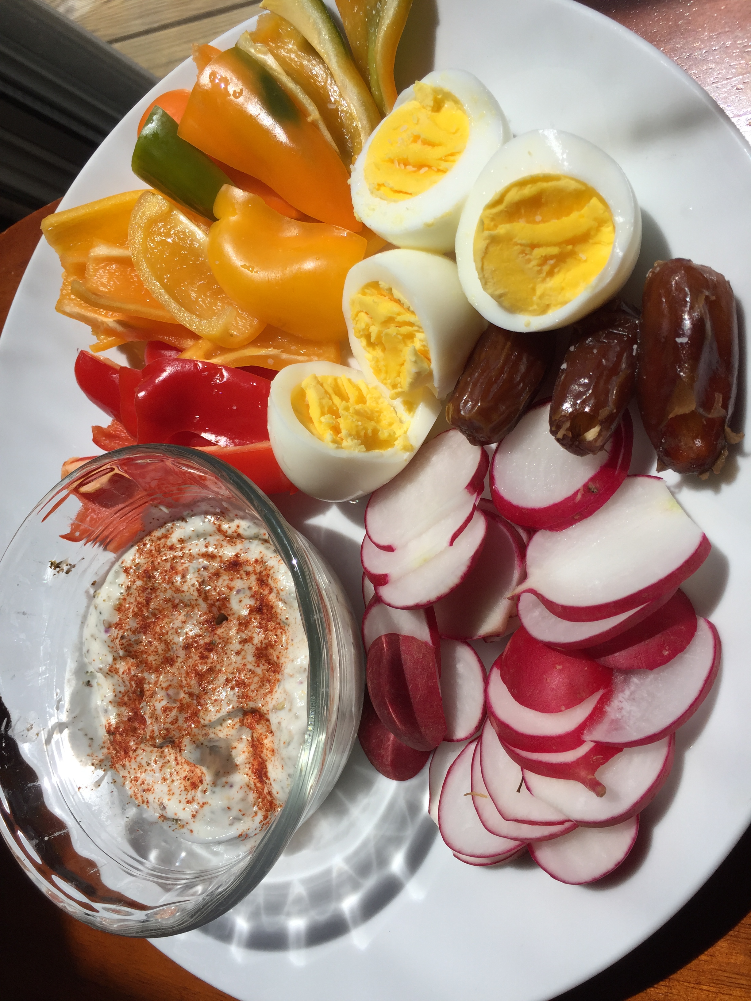 So today’s lunch was cut up veggies (radishes, sweet peppers), boiled eggs, dates and a 1/2 cup of yogurt with Za’atar mixed in.