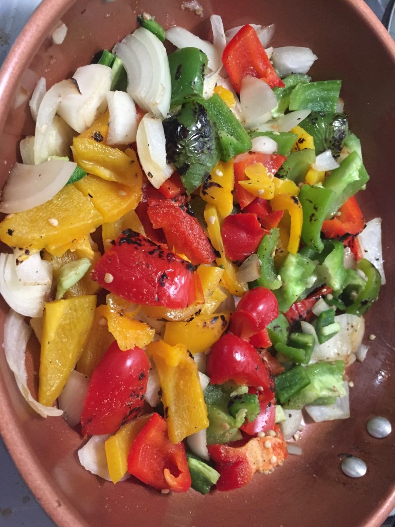 Char your veggies over a BBQ or on a gas stove. Place them in a bowl with plastic wrap to steam them.