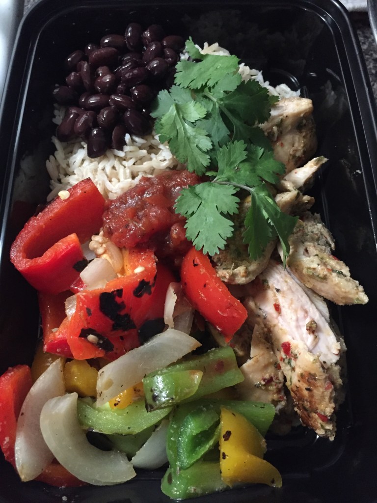 Add 3/4 cup/ 112g of brown rice to bowl, add 1 cup/130 g of chicken to each bowl, add 1 cup/148 g of veggies to bowl, add 2 tablespoons/52g of black beans, add 1 tablespoons/32 g of salsa.
