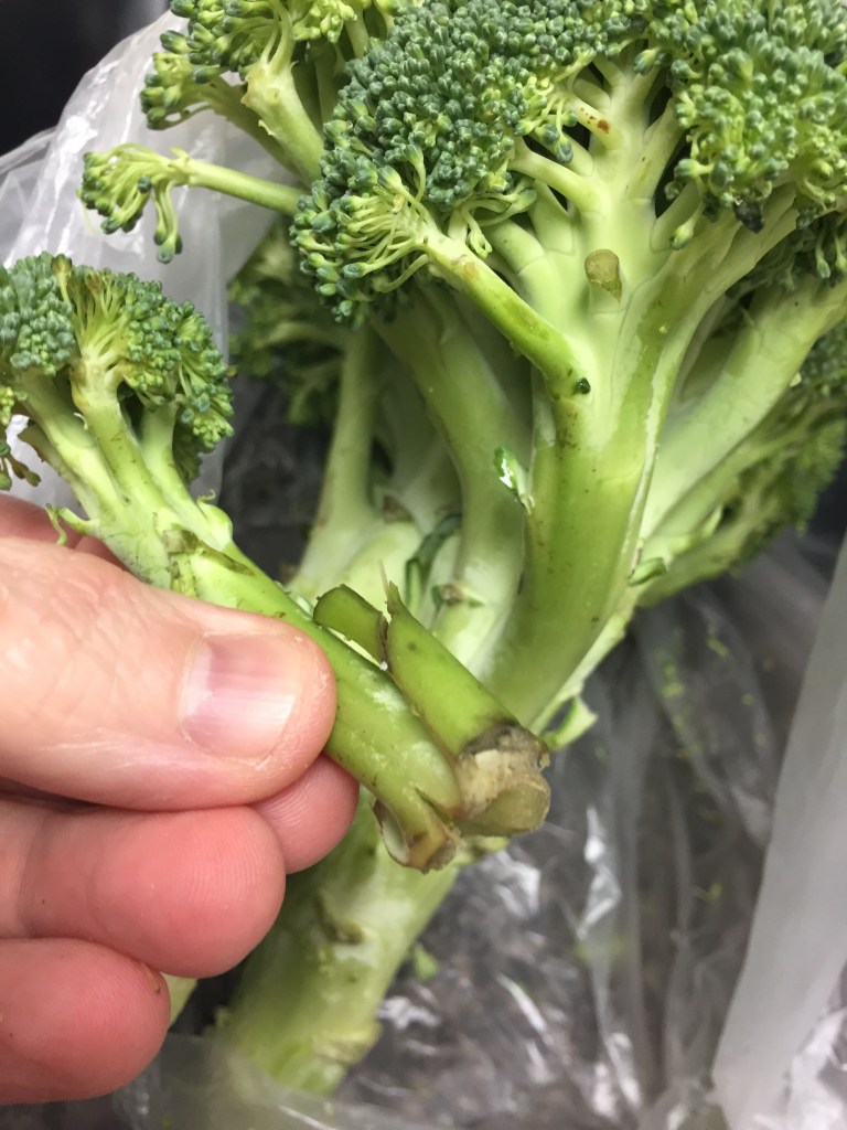If your broccoli is browning on the crown in spots, and or the stalks looking warn and old. Trim the brown spots off and remove the stems.