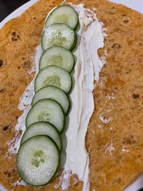 lay out the wrap, spread the cream cheese in a line on the wrap.