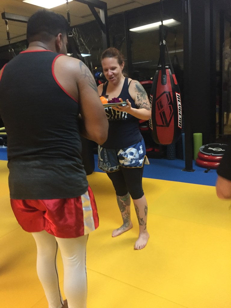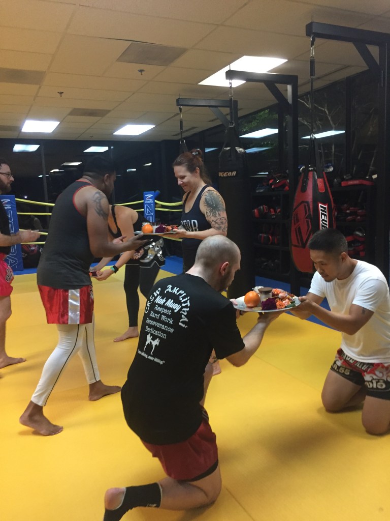 At the end of class, I asked for a moment before we bowed out and everyone left. I gathered the H, JD, A, and we presented the trays to them. I explained to our fellow students that this month is Wai Kru month and we are honoring our teachers, thanking them for teaching us, and want them to know how much we love them.