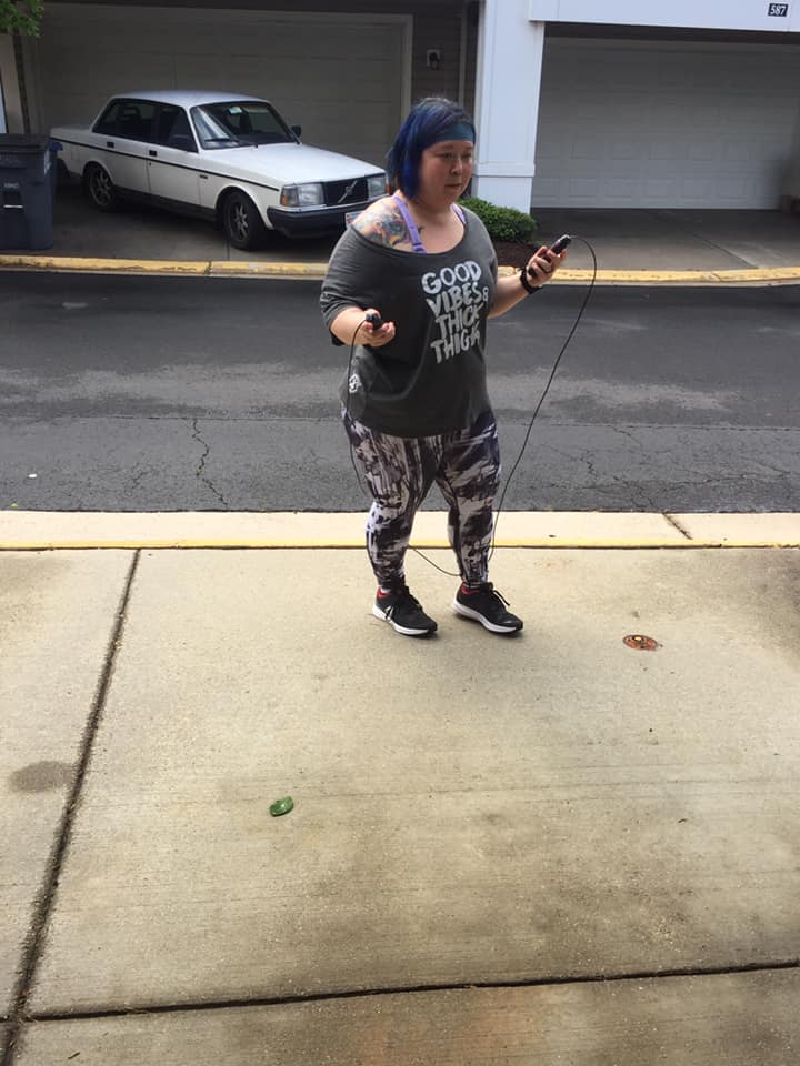 Training: we always start with jumping rope, today we alternated between skip knees, Jumping Jacks, and Squat Jumps for active rest.